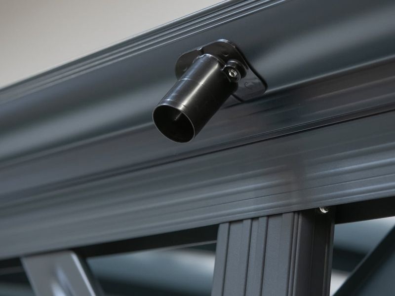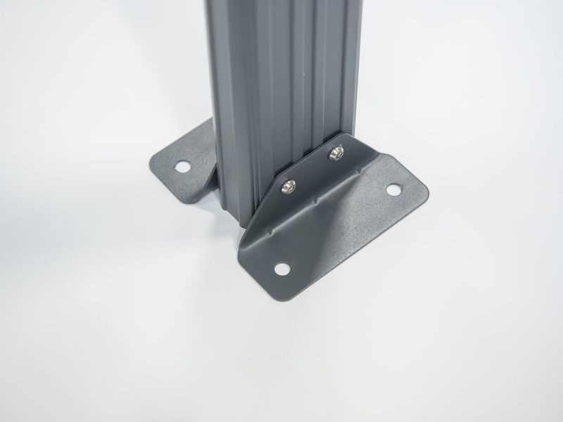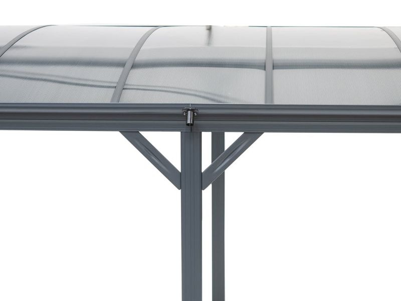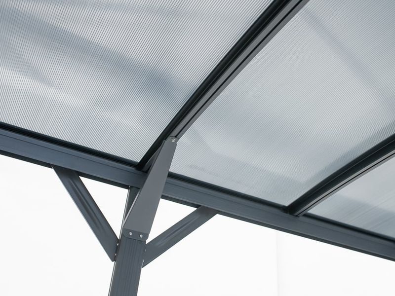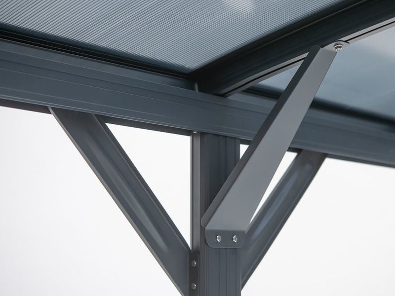 Pevný rám z práškově lakovaného hliníku v barvě antracit (RAL 7016) je odolný proti korozi a nevyžaduje žádnou speciální údržbu. Přístřešek je koncipován pro celoroční venkovní použití.