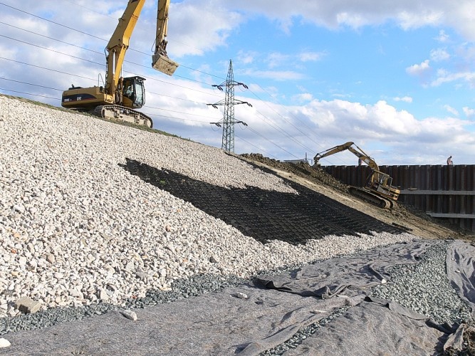 2. Před instalací geobuněk je nutné v koruně a patě svahu vyhloubit kotevní rýhy, do kterých geobuňky ukotvíte. Hloubka rýhy = výška geobuněk + 200–500 mm (dle konkrétní realizace).