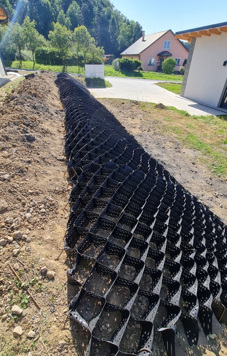 Zjednodušeně si lze geobuňky představit jako tahací harmoniku – při instalaci se rozvinou na požadovanou plochu. Následně se zasypou výplňovým materiálem, čímž dosáhnete požadovaného zpevnění podloží.
