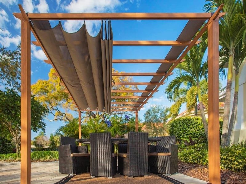 Namísto pevného zastřešení je pergola vybavena vzdušnou balkovou konstrukcí. O zastínění se postará polyesterové plátno o tloušťce 0,8 mm, které poskytuje až 70% ochranu proti UV záření, je vodoodpudivé a snadno se čistí. V zimních měsících je vhodné plátno usušit a uskladnit.
