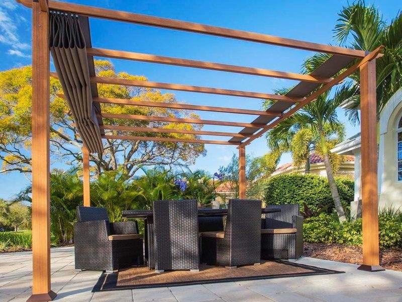 Pergola není opatřena pevným hardtopem, ale vzdušnou lamelovou konstrukcí. O flexibilní zastínění se postará polyesterové sluneční plátno o tloušťce 0,8 mm, které poskytuje až 70% ochranu proti UV záření. Plátno je vodoodpudivé a snadno se čistí měkkým hadříkem a mýdlovou vodou.