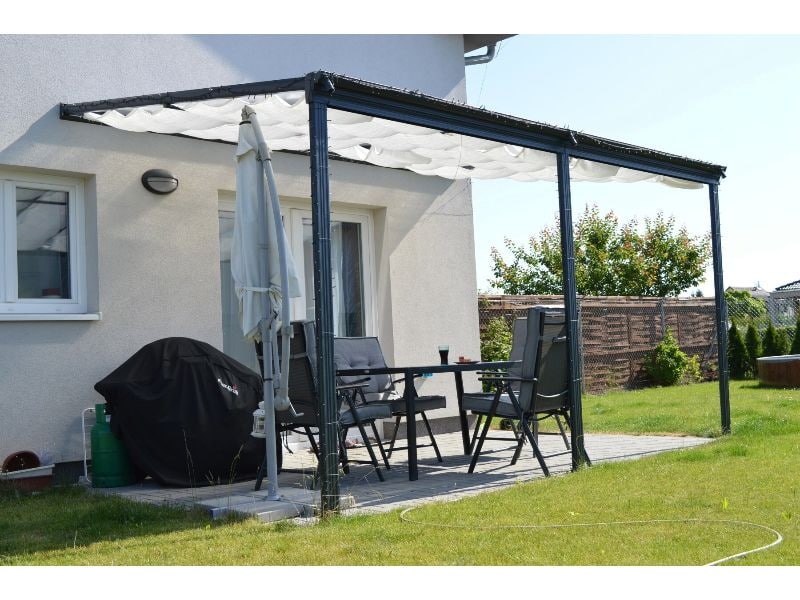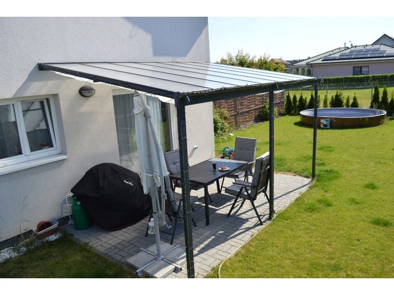 Konstrukce pergoly je vyrobená z odolné hliníkové slitiny a je nastříkaná práškovou vypalovanou barvou (komaxit), proto trvale odolává přírodním klimatickým vlivům. Střecha je vyrobená z polykarbonátových dvoustěnných desek o síle 6 mm, které dodáváme ve třech barvách: