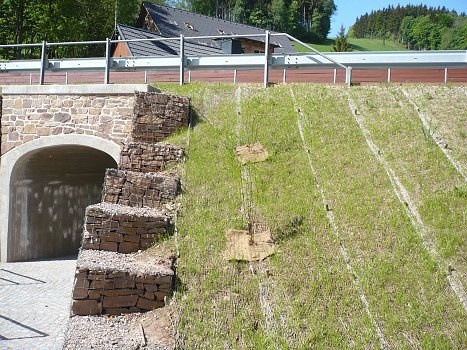 c) na upravený svah (opět již lehce zhutněný) provedete výsadbu zeleně a pak na něj položíte netkanou textilii Agrotex N 50 a na ní opět Geomanet K700