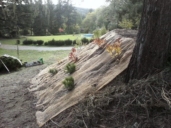 Kokosová rohož s jutovou sítí chrání svahy před erozí