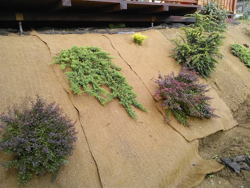 zda na svah se sklonem cca 45 stupňů o délce 8 metrů a šířce 4 metry je vhodná rohož Geomat K-PF? Svah bude osázen pokryvnými rostlinami a pokryt mulčovací kůrou.