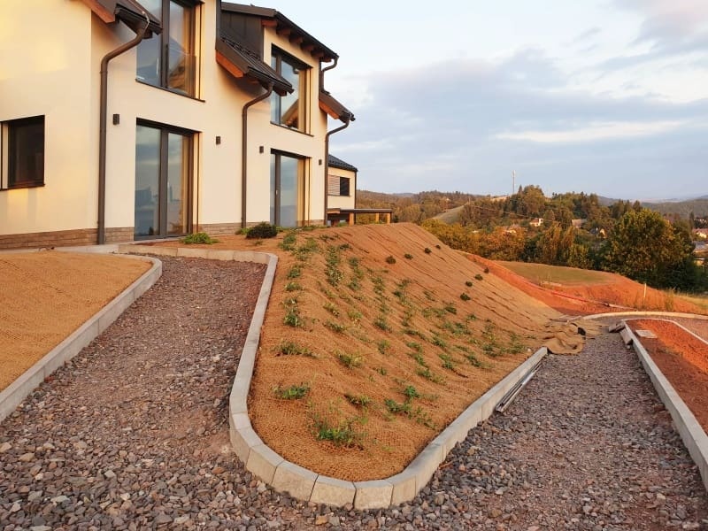 Naše představa je použít geotextilii, na to kokosovou sít geomanet K 700 nebo 900. Osázet keři do svahu. Dole upevnit kameny, ale nevíme jak upevnit nahoře. Pokud dáme geotextilii až přes hranu, neporoste tam tráva. Jaký je postup upevnění geotextilie i rohože u vrchní části tak, aby nahoře rostla tráva /napadá nás zastřihnout geotextilii ještě pod vrcholem, ale aby zase nesjela. Díky za radu. Případně dodám foto.