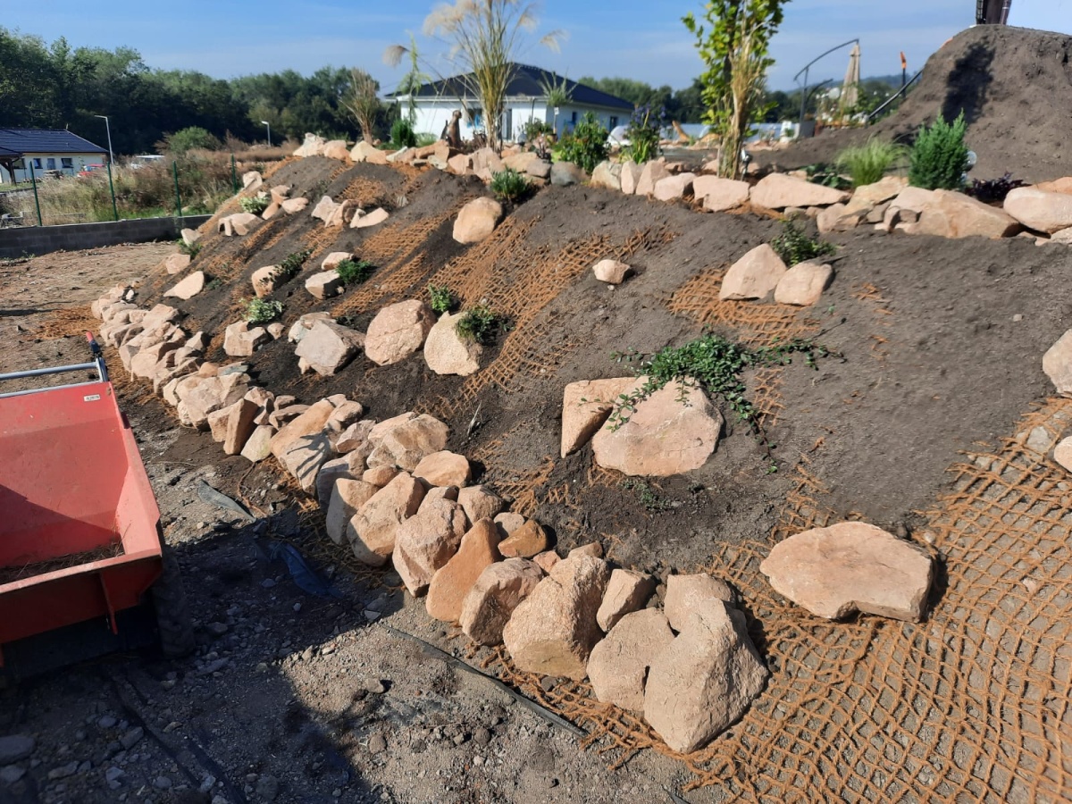 prosím o radu. Na jaře jsme na mírném svahu vybudovali skalku (skalničky, drobné keře a jehličnany), kterou jsme zpevnili rozmístěním vápencových kamenů o velikosti 30 - 40 cm. Bohužel při prudkých deštích dochází k erozím a splavování hlíny. Nyní zvažujeme na svah natáhnout kokosovou geotextilií. Jak máme postupovat? U keříku se bude muset textilie nastřihnout (jak?) a co kolem kamenů? Máme položit kameny na textilii? Děkuji moc za odbornou radu. Hezký den