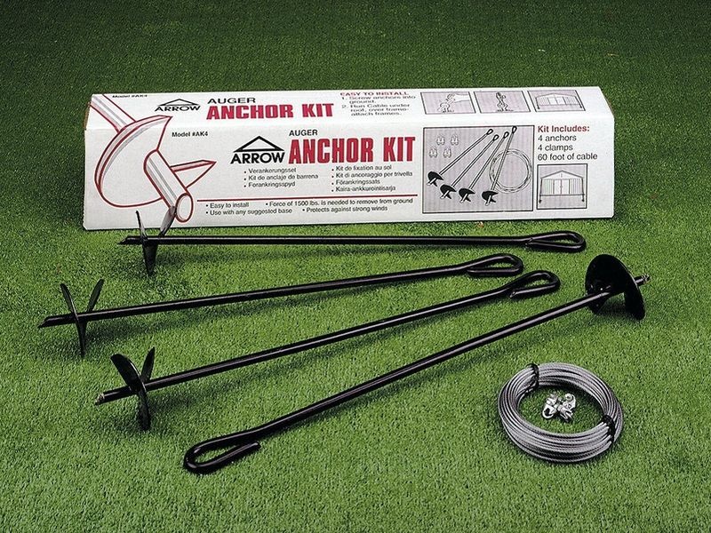 Kotvící sada do země pro montáž kovových zahradních domků Arrow. Sada obsahuje: 4 kotvy do země, lana a úchyty. S jejich pomocí jednoduše a správně připevníte váš domeček k zemi.