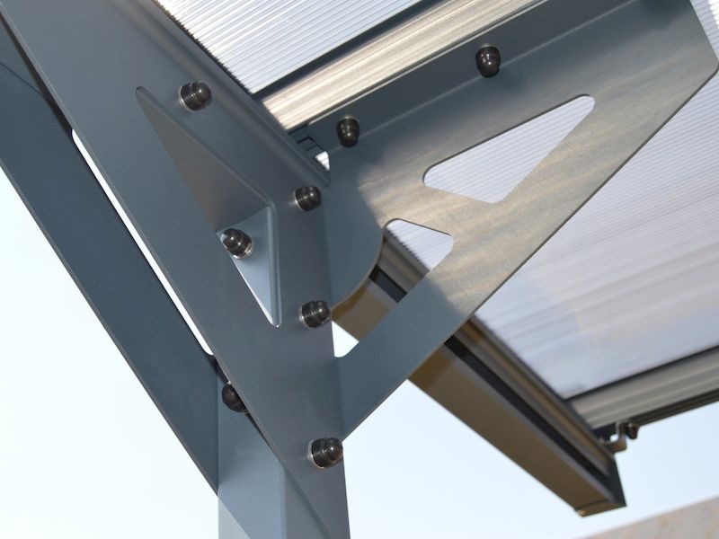 Robustní a odolná konstrukce je tvořena z obdélníkových hliníkových profilů 50 × 70 mm opatřených vypalovanou práškovou barvou (odstín antracit). Střecha je vyrobena z čirého komůrkového polykarbonátu síly 6 mm.