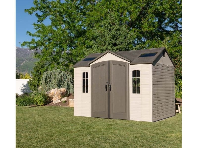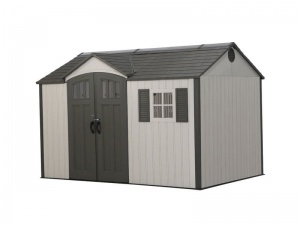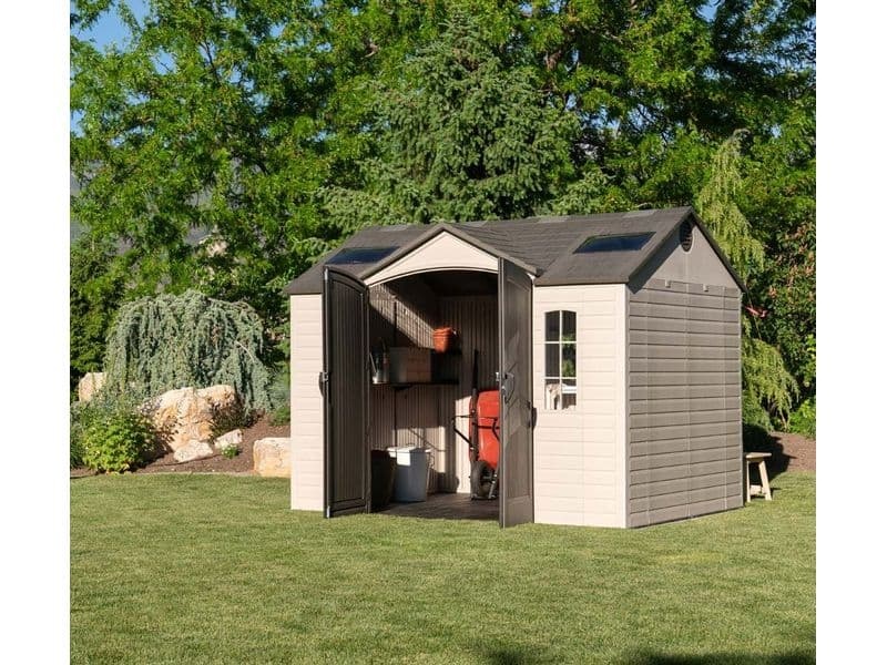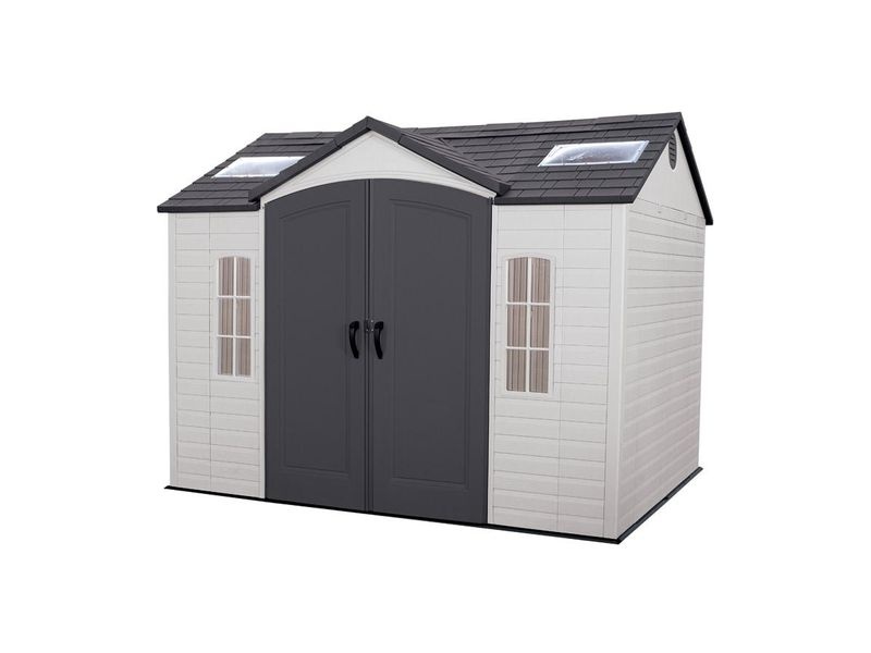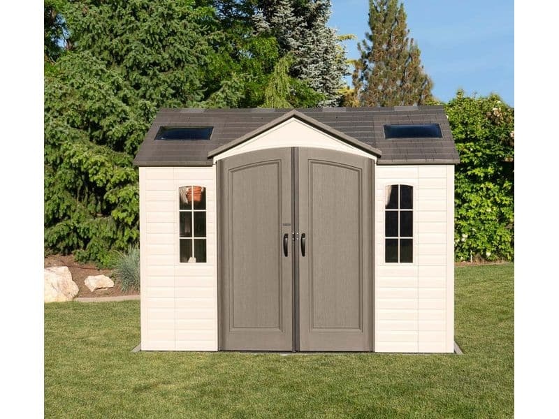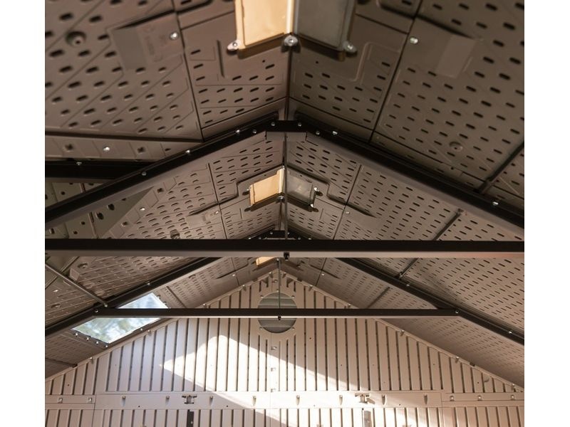 Sklon střechy u tohoto modelu zahradního domku je 30 stupňů, což výrazně snižuje množství a tlak sněhu na střešní konstrukci. Zahradní domek je dále vybaven dvojitými dveřmi na pantech, které zajišťují větší komfort při ukládání náčiní a jiného vybavení do plastového domku.