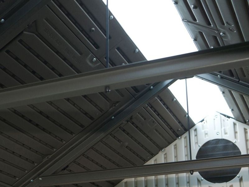 Konstrukce z dvoustěnného, kovem vyztuženého plastu HDPE (tvrdý polyethylen) zajišťuje domku obrovskou stabilitu. Střešní konstrukce z vysoce výkonné oceli vydrží zatížení až 115 kg/m² a ideální sklon střechy navíc umožňuje rychlý odtok vody a sněhu.