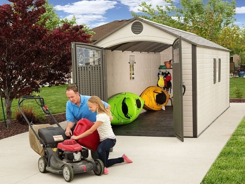 Součástí domku jsou také velké dvoukřídlé dveře, které umožňují snadný přístup a jednoduché uložení vašeho vybavení. Můžete tak v domku bez problému uschovat i širší zahradní náčinní.