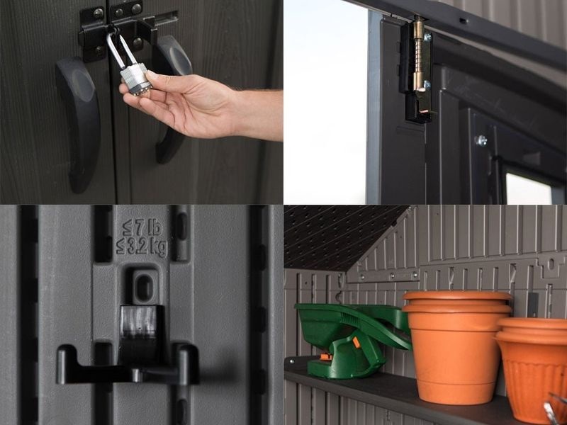 Součástí domku je police (228×25 cm), na které můžete uschovat například kufr s nářadím. Dále šest nástěnných háčků, na které můžete pověsit například zahradní nůžky, abyste je měli stále na očích.