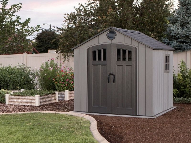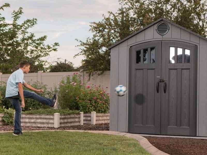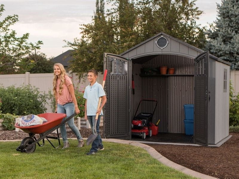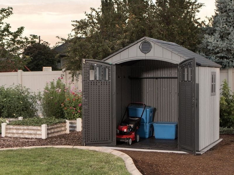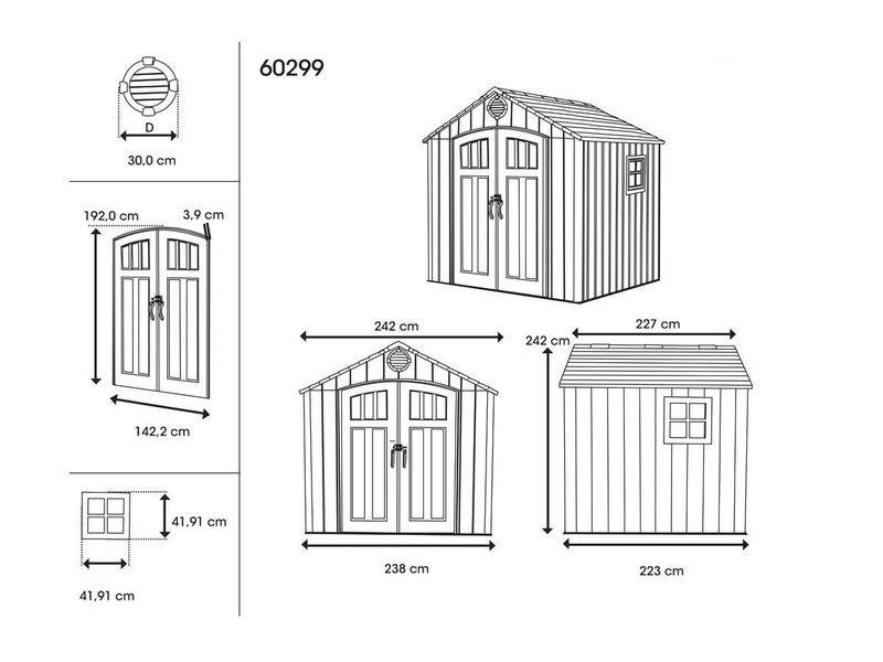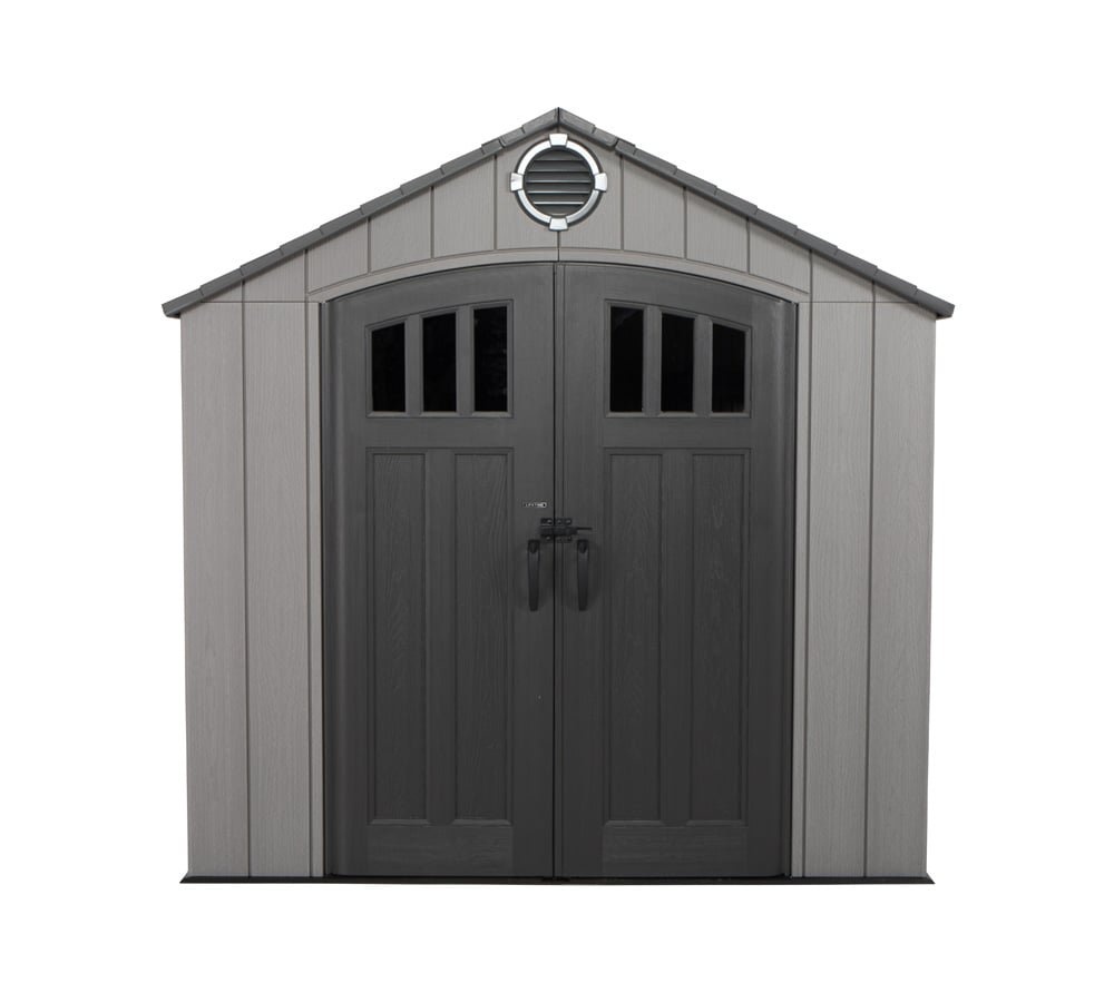 Součástí domku jsou také velké dvoukřídlé dveře, které umožňují snadný přístup a jednoduché uložení vašeho vybavení. Můžete tak v domku bez problému uschovat i širší zahradní náčinní.