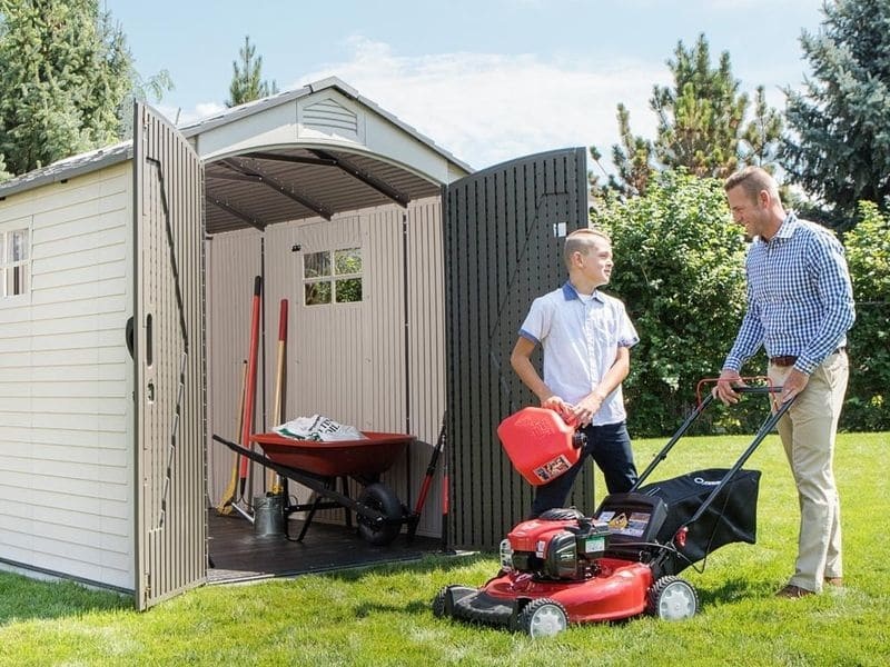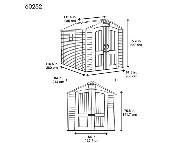 Součástí domku jsou také velké dvoukřídlé dveře, které umožňují snadný přístup a jednoduché uložení vašeho vybavení. Můžete tak v domku bez problému uschovat i širší zahradní náčinní.