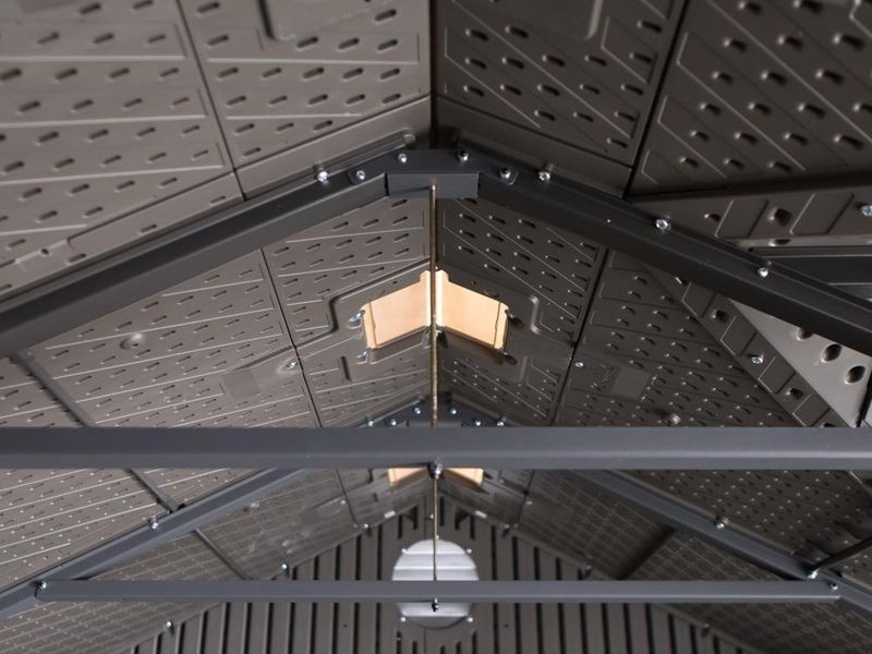 Konstrukce z dvoustěnného, kovem vyztuženého plastu HDPE (tvrdý polyethylen) zajišťuje domku obrovskou stabilitu. Střešní konstrukce z vysoce výkonné oceli vydrží zatížení až 112 kg/m² a ideální sklon střechy navíc umožňuje rychlý odtok vody a sněhu.