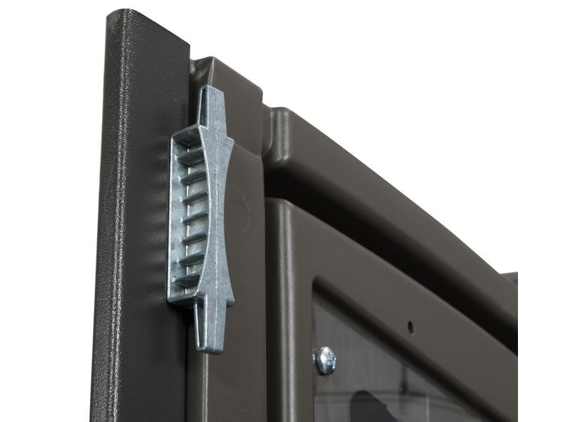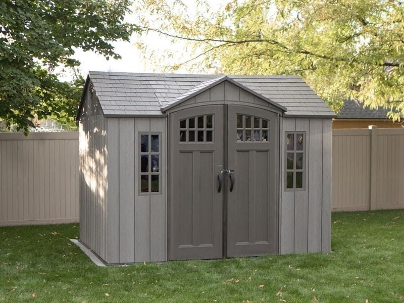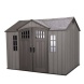 Součástí domku jsou také velké dvoukřídlé dveře, které umožňují snadný přístup a jednoduché uložení vašeho vybavení. Můžete tak v domku bez problému uschovat i širší zahradní náčinní.