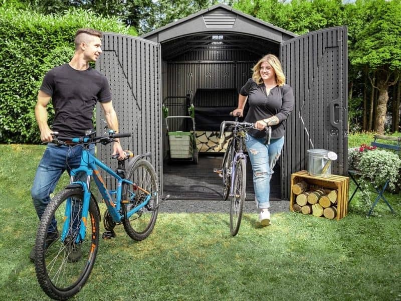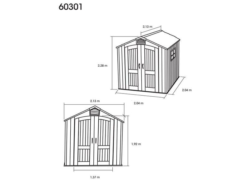 Součástí domku jsou také velké dvoukřídlé dveře, které umožňují snadný přístup a jednoduché uložení vašeho vybavení. Můžete tak v domku bez problému uschovat i širší zahradní náčinní.