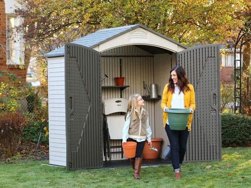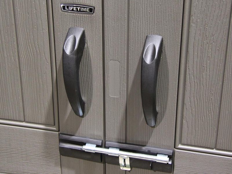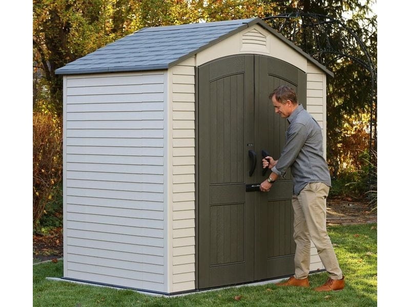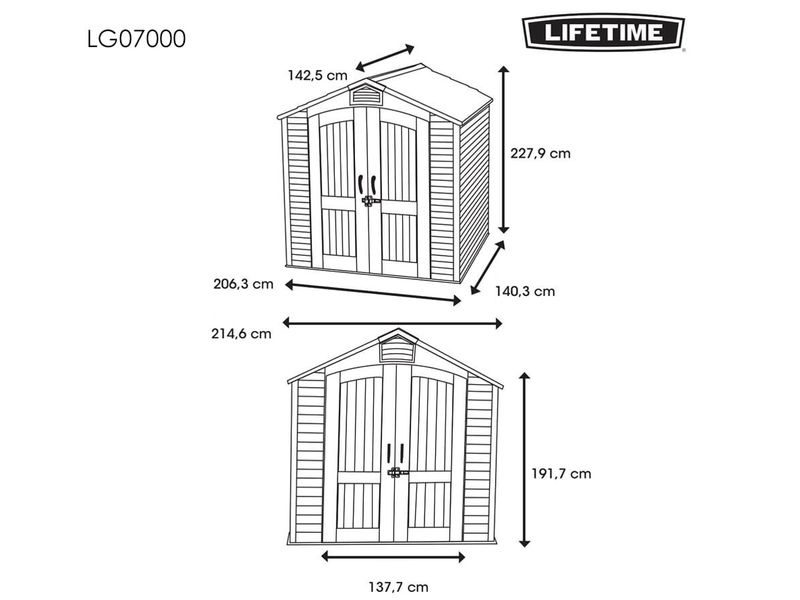 Součástí domku jsou také velké dvoukřídlé dveře, které umožňují snadný přístup a jednoduché uložení vašeho vybavení. Můžete tak v domku bez problému uschovat i širší zahradní náčinní.