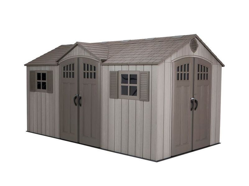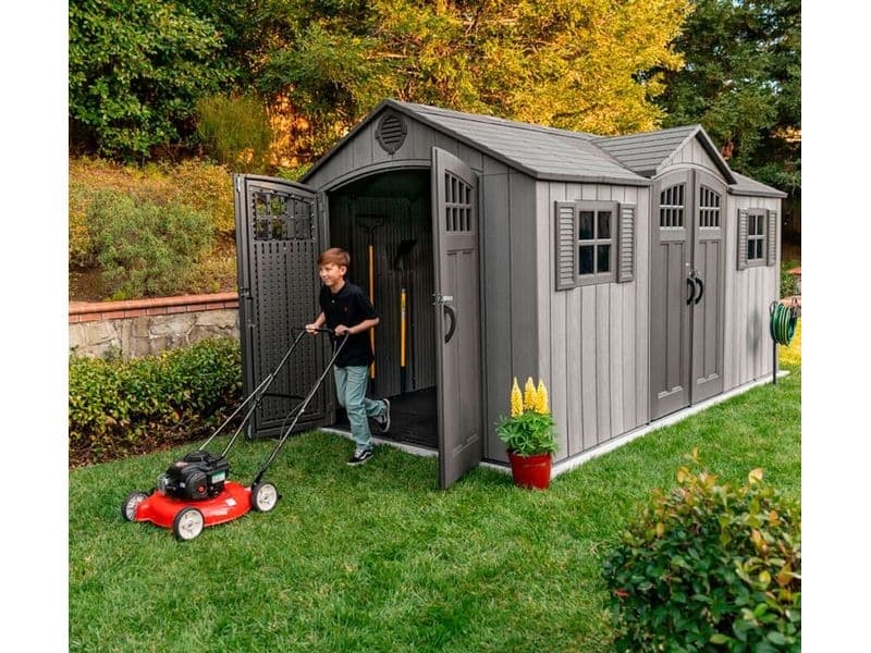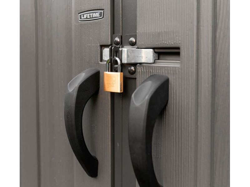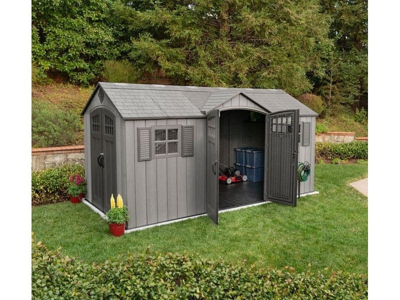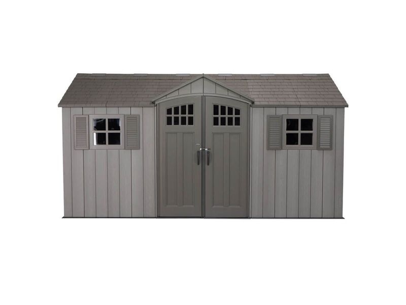 Zahradní domek je dále vybaven dvěma dvojitými dveřmi na pantech s prosklením, které zajišťují větší komfort při ukládání náčiní a jiného vybavení do plastového domku. Díky hrubému povrchu stěn v tmavě šedé barvě („Rough-Cut“ s mimikou dřeva) je kůlna nejen praktickým přístřeškem pro vaše nářadí a zahradní potřeby, ale také skutečnou ozdobou vaší zahrady.