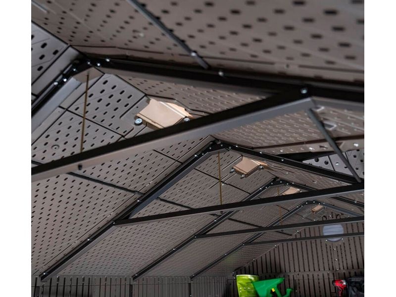 Zahradní domek získává svou obrovskou stabilitu díky konstrukci z dvoustěnného, kovem vyztuženého HDPE plastu (tvrdý polyethylen). Střešní konstrukce z vysoce výkonné oceli vydrží zatížení až 115 kg/m² a ideální sklon střechy 23 % navíc umožňuje rychlý odtok vody a sněhu. Součástí zahradní domku je protiskluzová podlaha (v ceně dodávky).