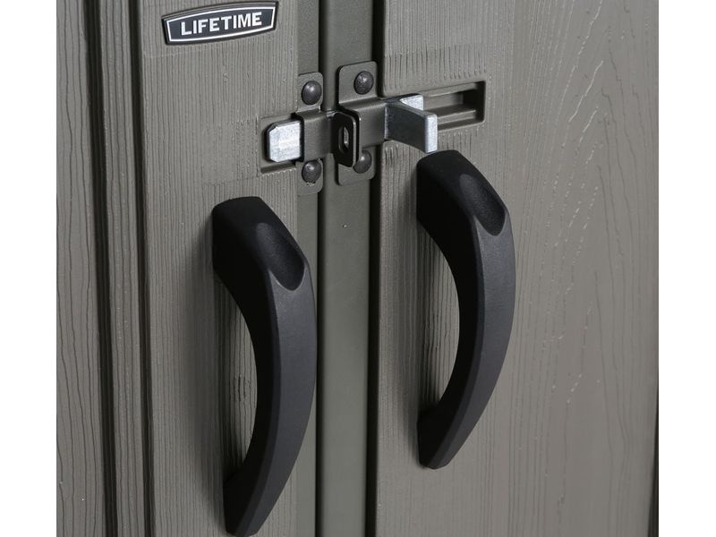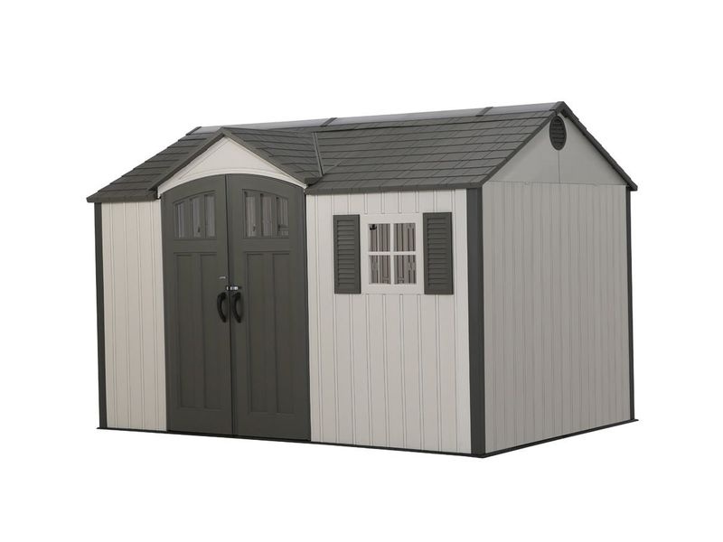 Zahradní domek je dále vybaven dvojitými dveřmi na pantech s prosklením, které zajišťují větší komfort při ukládání náčiní a jiného vybavení do plastového domku. Díky hladkému, světle šedému povrchu stěn kůlna přirozeně a nenápadně zapadne do téměř každé zahrady.