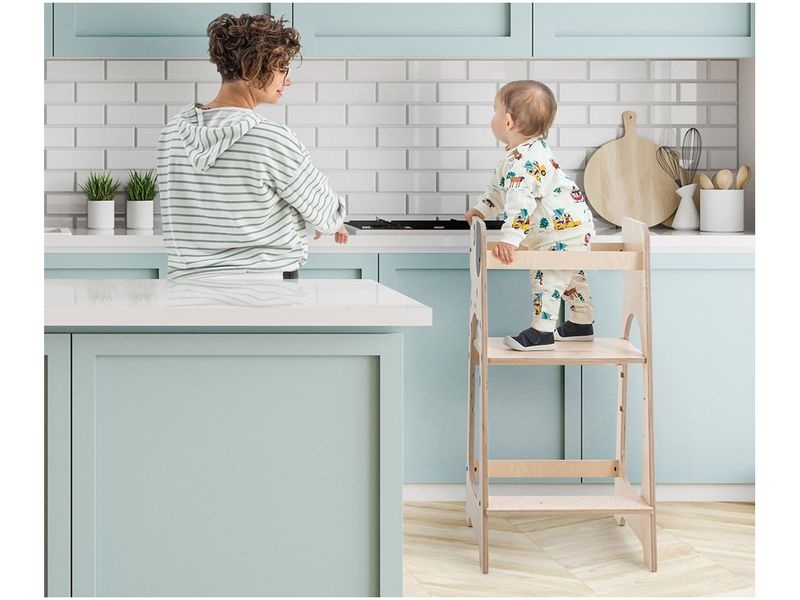Učící věž je vyrobena z certifikované udržitelné březové překližky, která zajišťuje robustnost a odolnost. Materiál je neošetřený, bez použití chemikálií, což zaručuje maximální bezpečnost pro vaše dítě. Díky zaobleným hranám je věž pohodlná a bezpečná pro každodenní použití.