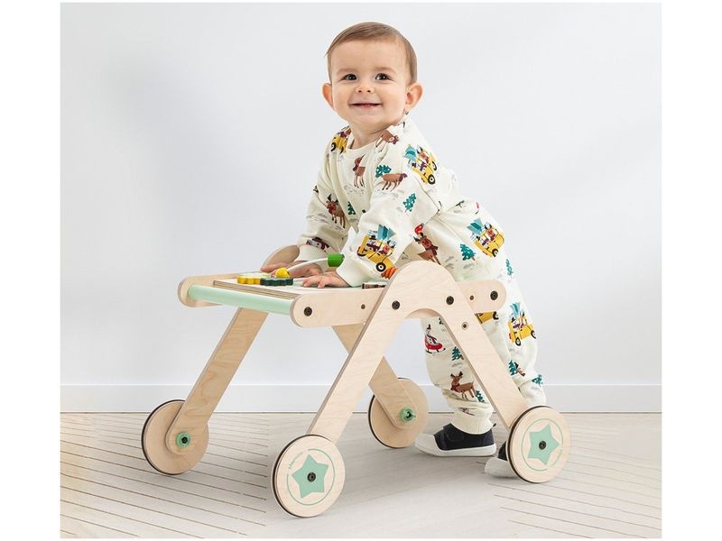 Trio WalkMe od MamaToyz je univerzální hrací stolek, který lze snadno přestavět na chodítko, což podporuje jemnou i hrubou motoriku a dává vašemu dítěti příležitost učinit první kroky bezpečně a s radostí. Stolek je výškově nastavitelný v 4 polohách (38–54 cm). Stolek disponuje integrovanými motorickými hračkami podporujícími zručnost. Pro stabilní hru je možnost pozastavení koleček a zároveň můžete také utáhnout nebo povolit všechny kolečka a ovlivnit tak rychlost otáčení pneumatik pro bezpečnost.