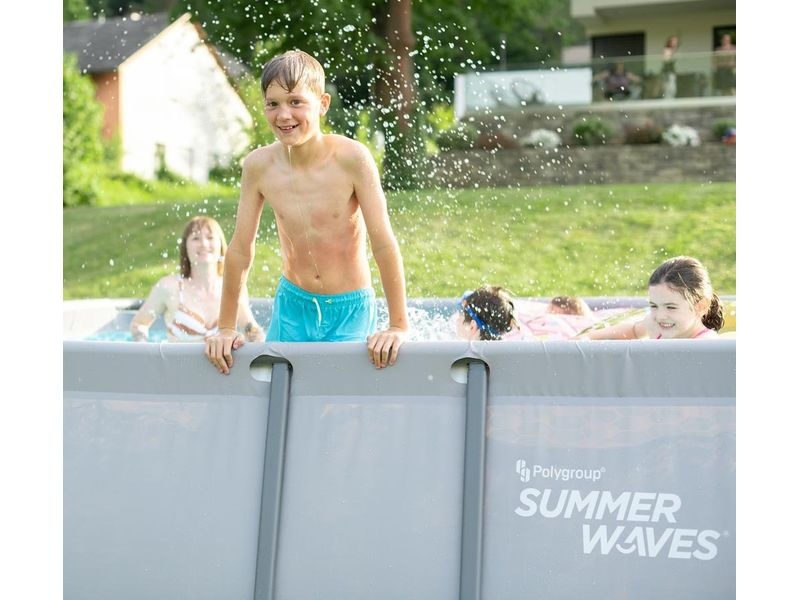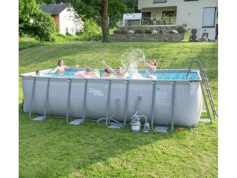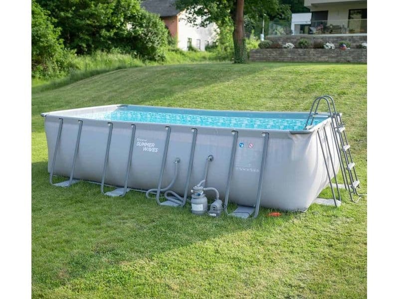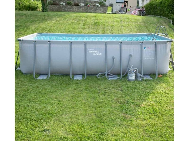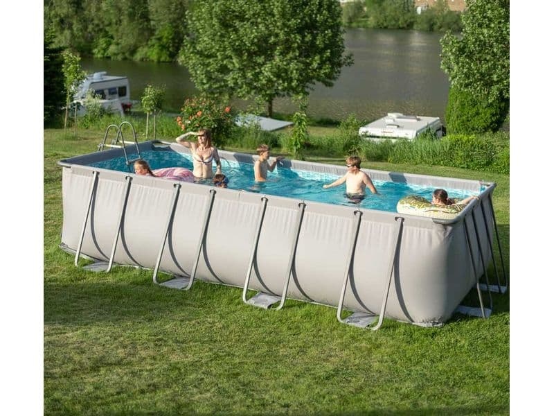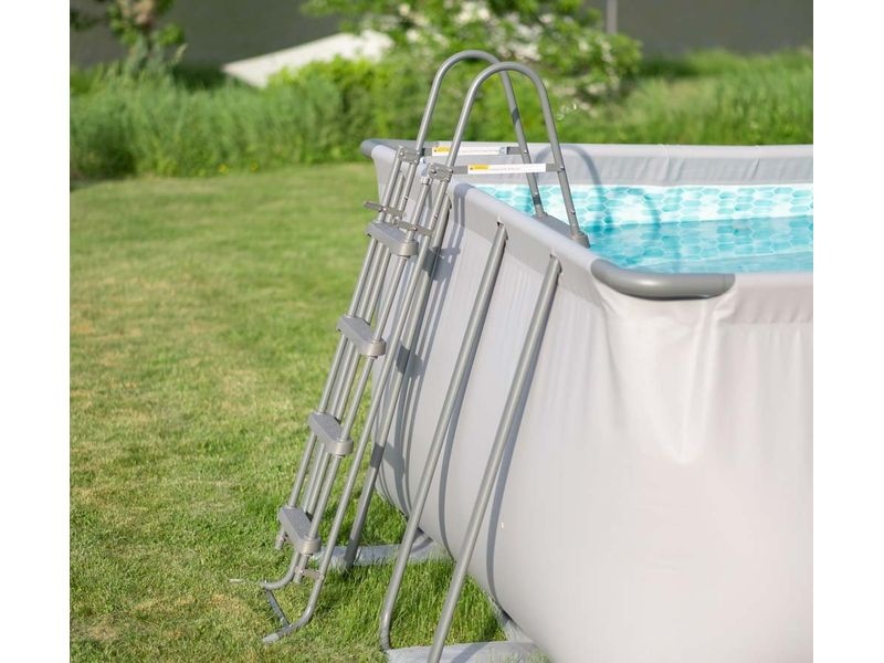 Rámová konstrukce nadzemního bazénu se skládá z trubek z pokovené oceli. Vnější stěna bazénu v elegantním šedém odstínu velmi dobře zapadne téměř do jakékoli zahrady.