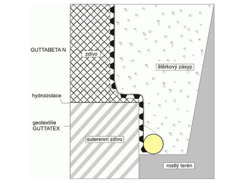 V případě použití fólie jako náhrady izolační přizdívky je možné fólii mechanicky kotvit pouze nad úrovní hydroizolace. K nopovým fóliím Guttabeta dopo­ručujeme používat kompatibilní originální příslušenství.
