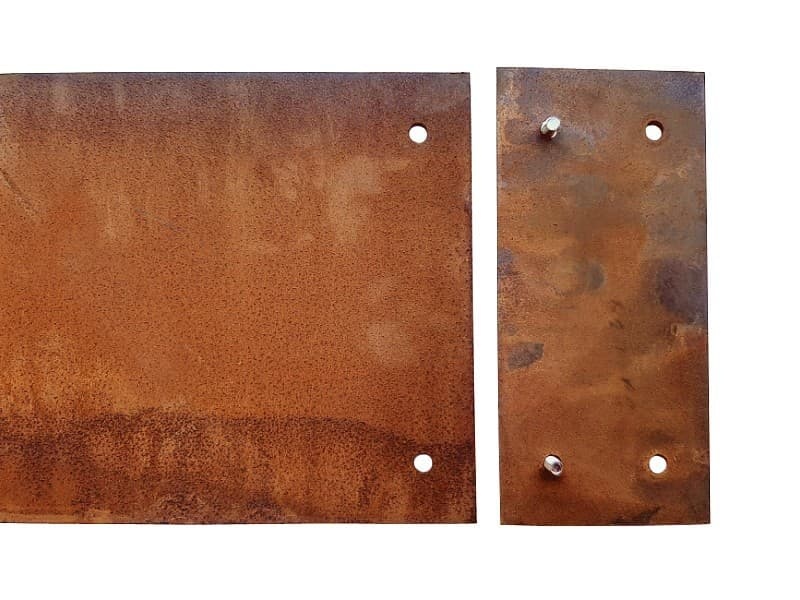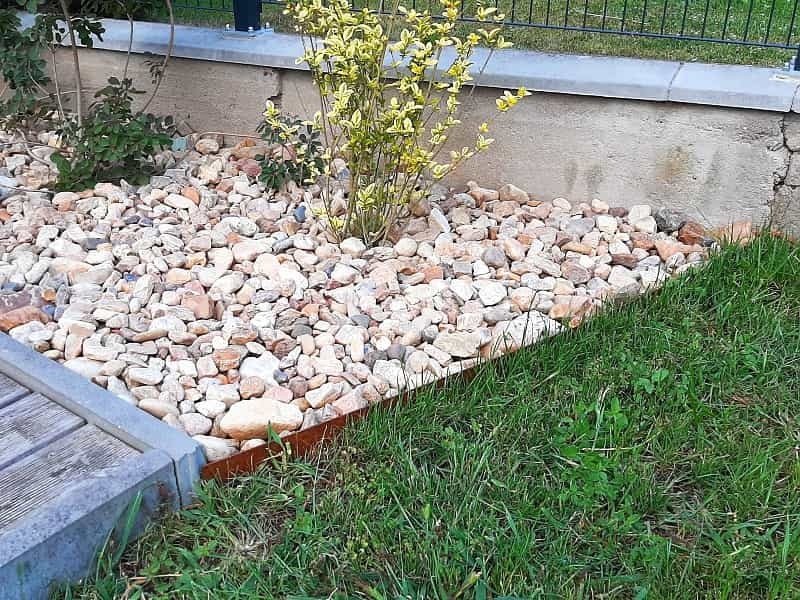 Obrubník je vyrobený z oceli se vzhledem cortenu. Po uložení obrubníků v zemině se působením větru začne na povrchu materiálu vytvářet rezavá patina, která zabraňuje další korozi.