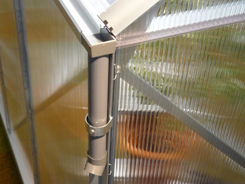Malý plastový svod dešťové vody z okapů skleníku. Na svod lze napojit hadici a dešťovku tak odvádět do zásobníku.