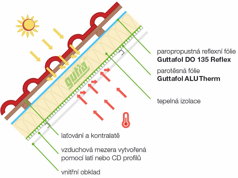 Schéma: Řez tepelnou izolací střechy s pomocí parotěsné reflexní fólie Guttafol ALU Therm a Guttafol DO 135 Reflex