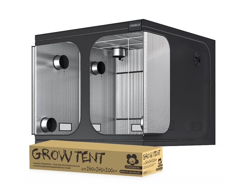 Pěstební stan VF 240 je vybaven větracími otvory se síťkou proti škůdcům, které pomáhají udržet rostliny chráněné před nežádoucím hmyzem. Dvojité větrací uzavíratelné otvory umožňují regulaci proudění vzduchu podle aktuálních potřeb. Průmyslový zip je navržen pro vysoké zatížení, což zajišťuje dlouhou životnost a snadné otevírání.