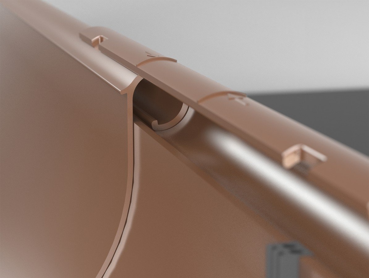 Plastová spojka Gutta Aqua 75 mm pro spojení dvou okapových žlabů. Spojky jsou bezúdržbové a barvostálé. Jejich montáž nevyžaduje lepení ani šroubování a odolávají korozi. Materiál je koextrudovaný PVC s vrchní vrstvou z polymetakrylátu (PMMA), který zaručuje barvostálost a dlouhou životnost.