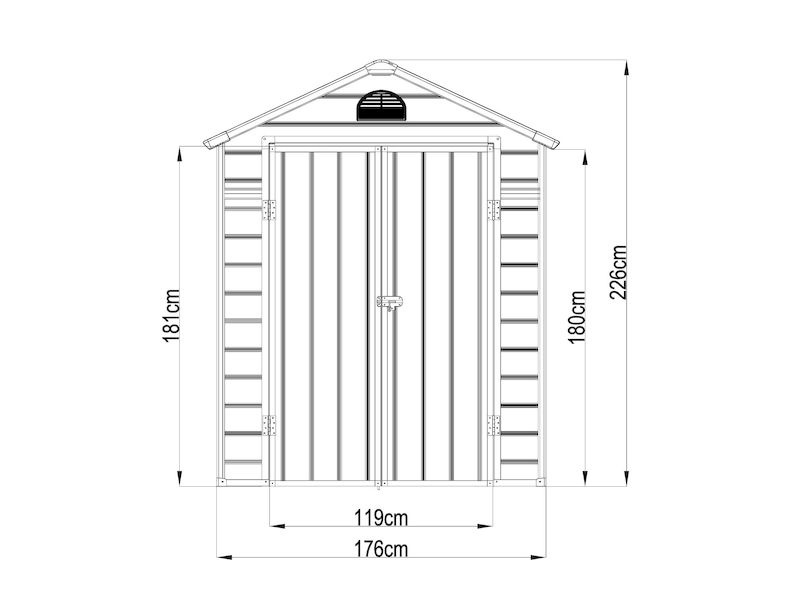 Dvojité křídlové dveře o rozměrech š 119 x v 181 cm zajišťují pohodlný přístup, zatímco síla plastové stěny 12 mm a sedlová střecha výrazně snižují tlak sněhu, čímž zvyšují odolnost domku vůči nepříznivým povětrnostním podmínkám.