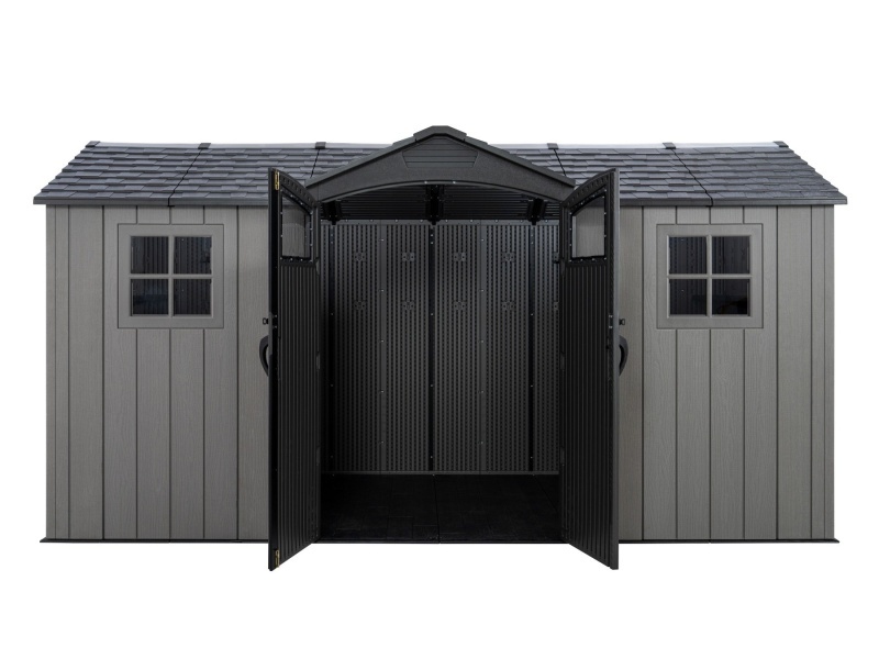 Součástí balení je plastová protiskluzová podlaha, která chrání uskladněné věci před vlhkostí. Dvoukřídlé dveře (129×189 cm) umožňují pohodlný vstup a snadné ukládání i rozměrnějšího nářadí nebo zahradní techniky.
