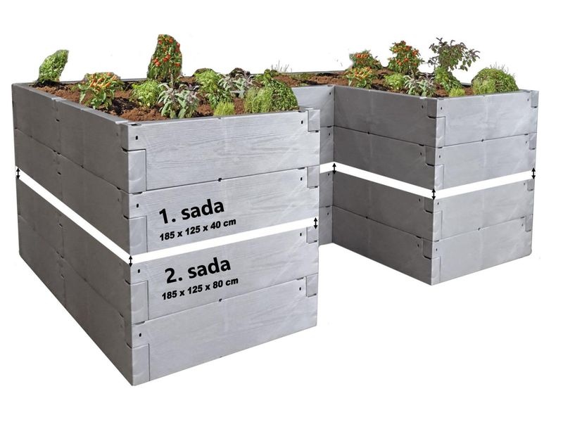 Dvoupartový vyvýšený záhon JUWEL TIMBER ERGOLINE Vám rozšíří zahradní sezónu. Záhon se skládá ze zídky ze dvou vrstev (pater) plastových „kamenů“.