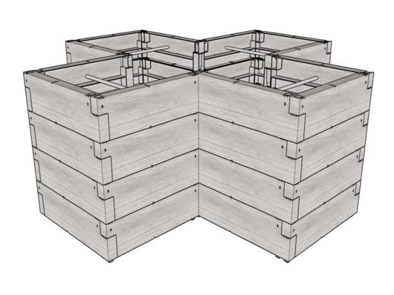 Každé patro vysokého záhonu je složeno ze 12-ti „kamenů“. Je možné seskládat 2× JUWEL TIMBER ERGOLINE do různých sestav. Vysoký záhon nemá pevné dno.