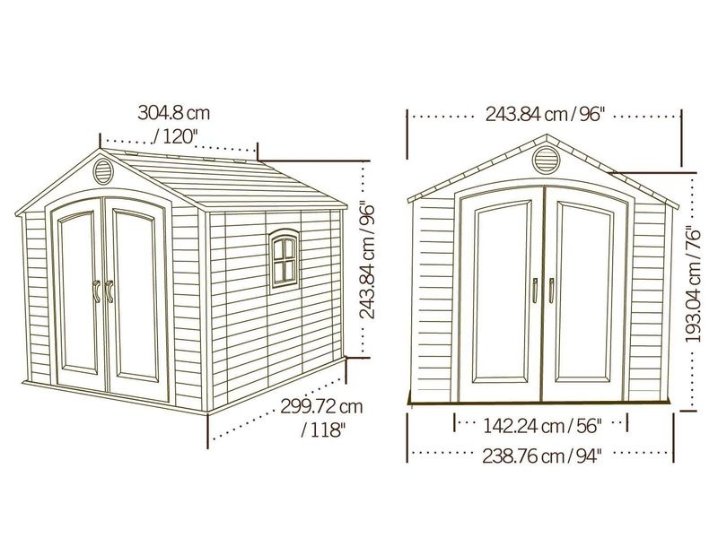 Zahradní domek je vybaven dvojitými dveřmi na pantech. Síla dvojité plastové stěny je 26 mm. Sklon střechy je 30 stupňů, což výrazně snižuje množství a tlak sněhu na střechu.