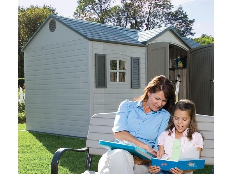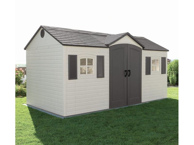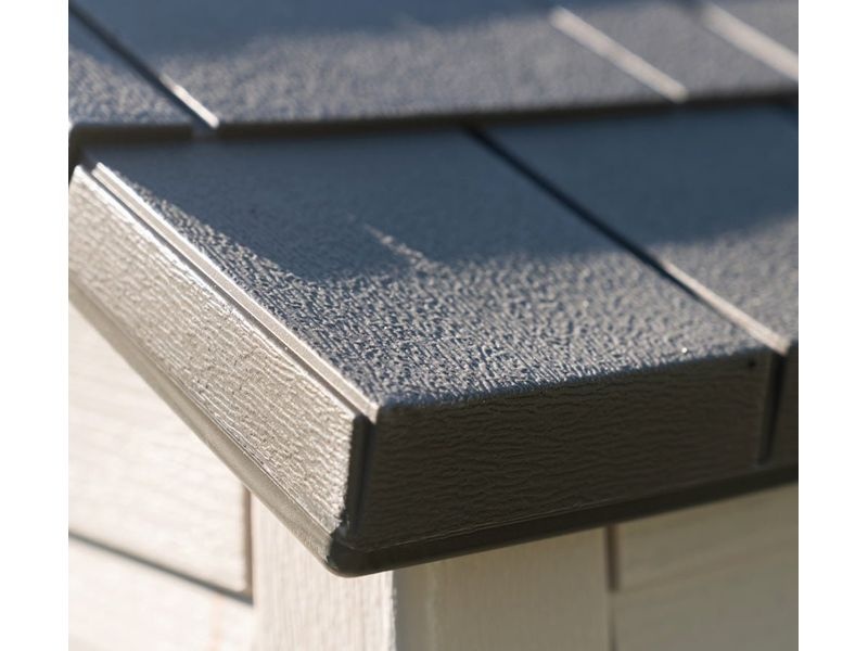 Sklon střechy u tohoto modelu zahradního domku je 30 stupňů, což výrazně snižuje množství a tlak sněhu na střešní konstrukci. Zahradní domek je dále vybaven dvojitými dveřmi na pantech, které zajišťují větší komfort při ukládání náčiní a jiného vybavení do plastového domku.