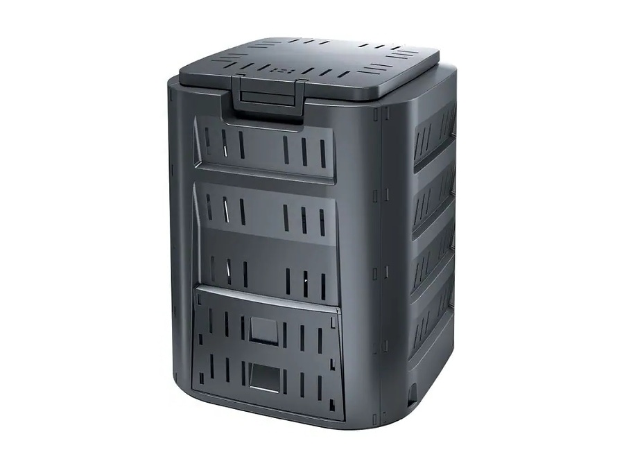 Kompostér je opatřen praktickým víkem, které chrání uskladněný materiál deště nebo slunečním žárem. Po stranách je plastový kompostér vybavený otvory pro lepší cirkulaci vzduchu a bočními dvířky pro snadné vyjímání kompostu.