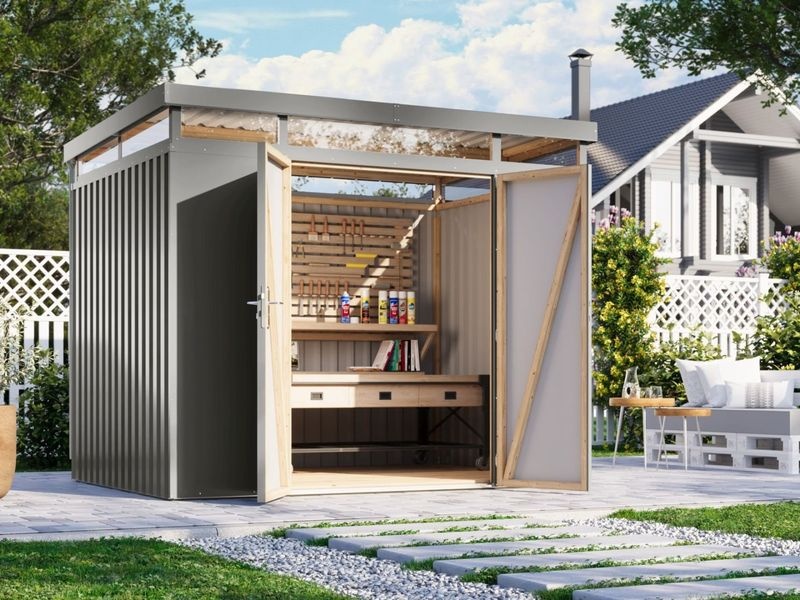 KARIBU AURUM 3 je prémiový plechový zahradní domek s robustní konstrukcí a moderním designem. Stabilní rám z lepeného lamelového dřeva (BSH) zajišťuje vysokou pevnost a přesnost montáže. Trapézový plech o síle 0,5 mm poskytuje dlouhodobou ochranu proti korozi, UV záření i nepříznivým povětrnostním podmínkám při minimálních nárocích na údržbu.