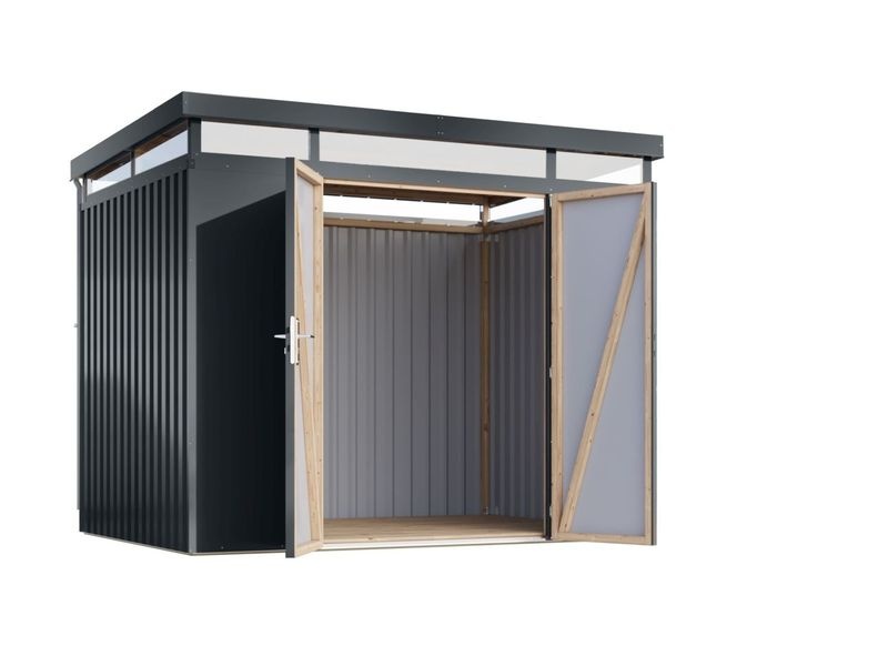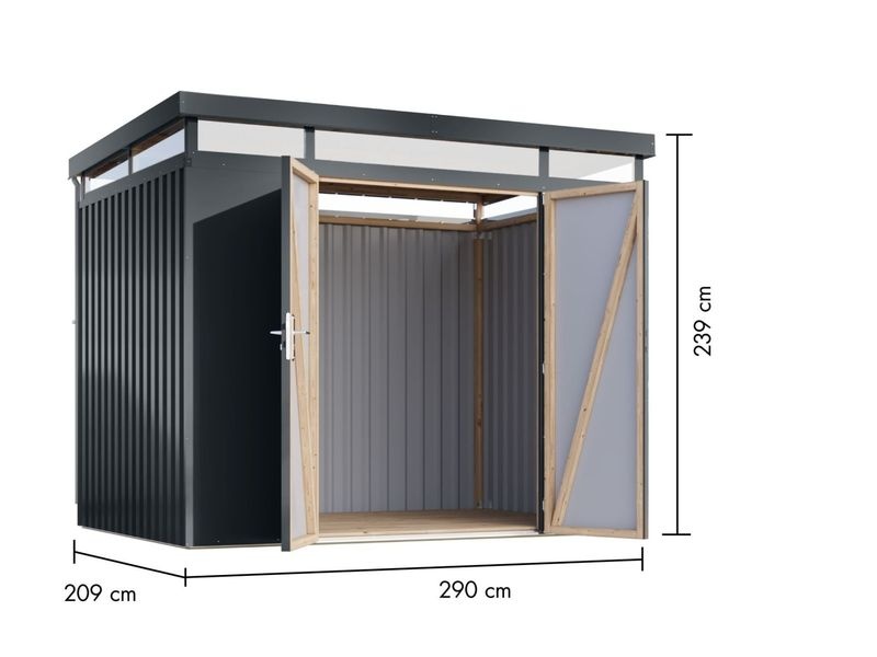 Prémiový kovový zahradní domek s obvodovým oknem a integrovaným odvodněním střechy. Rozměry: š.290 × d.209 × v.239 cm. Zastavěná plocha: 6,04 m².