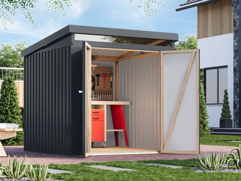 Moderní plechový domek KARIBU IRIDIUM 2 kombinuje odolné kovové opláštění s pevnou nosnou konstrukcí z lepeného lamelového dřeva (BSH). Tato kombinace zajišťuje vysokou stabilitu, dlouhou životnost a zároveň snadnou montáž.