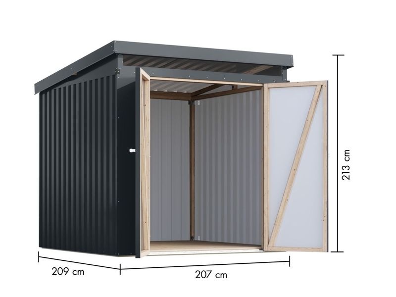 Plechový zahradní domek s integrovaným oknem z plexiskla a stabilní konstrukcí z BSH hranolů. Rozměry: š.207 × d.209 × v.213 cm. Zastavěná plocha: 4,33 m².