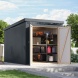Stěny z pozinkovaného trapézového plechu o síle 0,5 mm jsou odolné vůči korozi, UV záření i nepříznivému počasí a nevyžadují pravidelnou údržbu. Integrované plexisklové okno (190 × 16 cm) přivádí do interiéru denní světlo. Cylindrický zámek se dvěma klíči zajišťuje bezpečné uložení nářadí, kol či zahradní techniky.