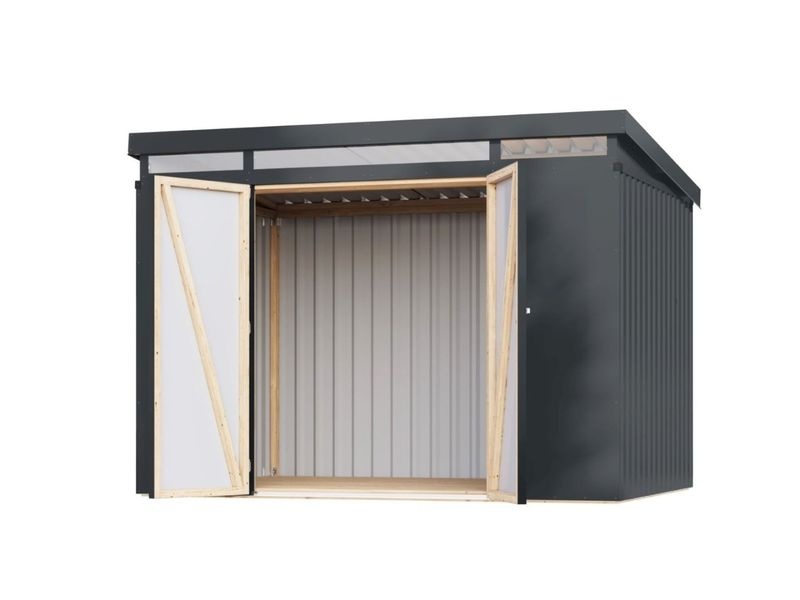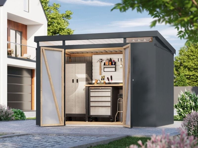 Moderní plechový domek KARIBU IRIDIUM 3 nabízí velkorysý úložný prostor a robustní konstrukci kombinující kovové opláštění s nosným rámem z lepeného lamelového dřeva (BSH). Tato konstrukce zajišťuje vysokou stabilitu, přesnost montáže a dlouhou životnost celé stavby.