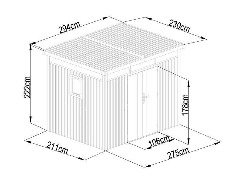 Tato praktická konstrukce váží 199 kg a má antracitovou barvu, která se snadno začlení do každého venkovního prostředí. Plochá střecha a dvojité křídlové dveře dodávají domku jednoduchý a moderní vzhled.