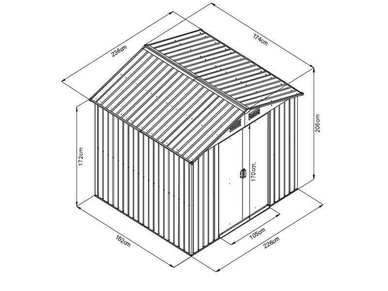 Kvalitní materiál s povrchovou úpravou – elektrolyticky pozinkovaný plech s žárově nanesenou barvou. Sedlová střecha, čelní posuvné dveře. Možnost uzamčení (zámek není obsahem dodávky).